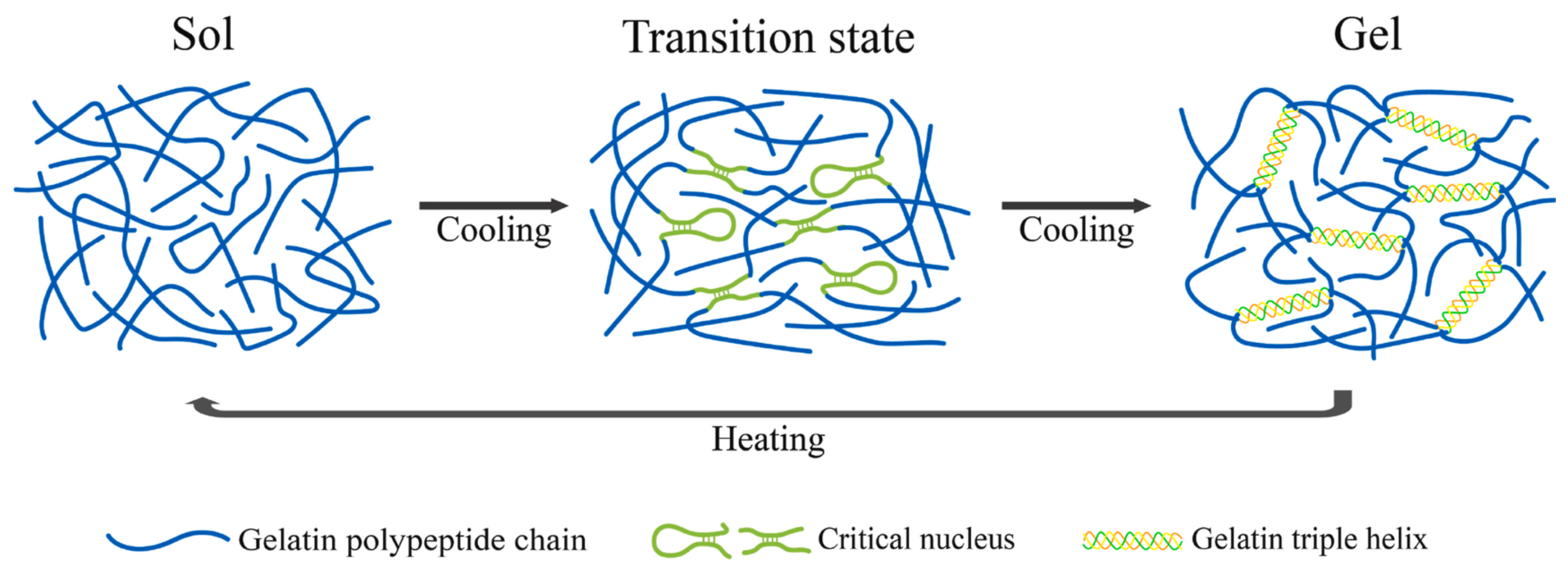 - Yang, Z.; Hemar, Y.; Hilliou, L.; Gilbert, E.P.; McGillivray, D.J.; Williams, M.A.; Chaieb, S. Nonlinear behavior of gelatin networks reveals a hierarchical structure. Biomacromolecules 2016, 17, 590–600. [Google Scholar] [CrossRef]
