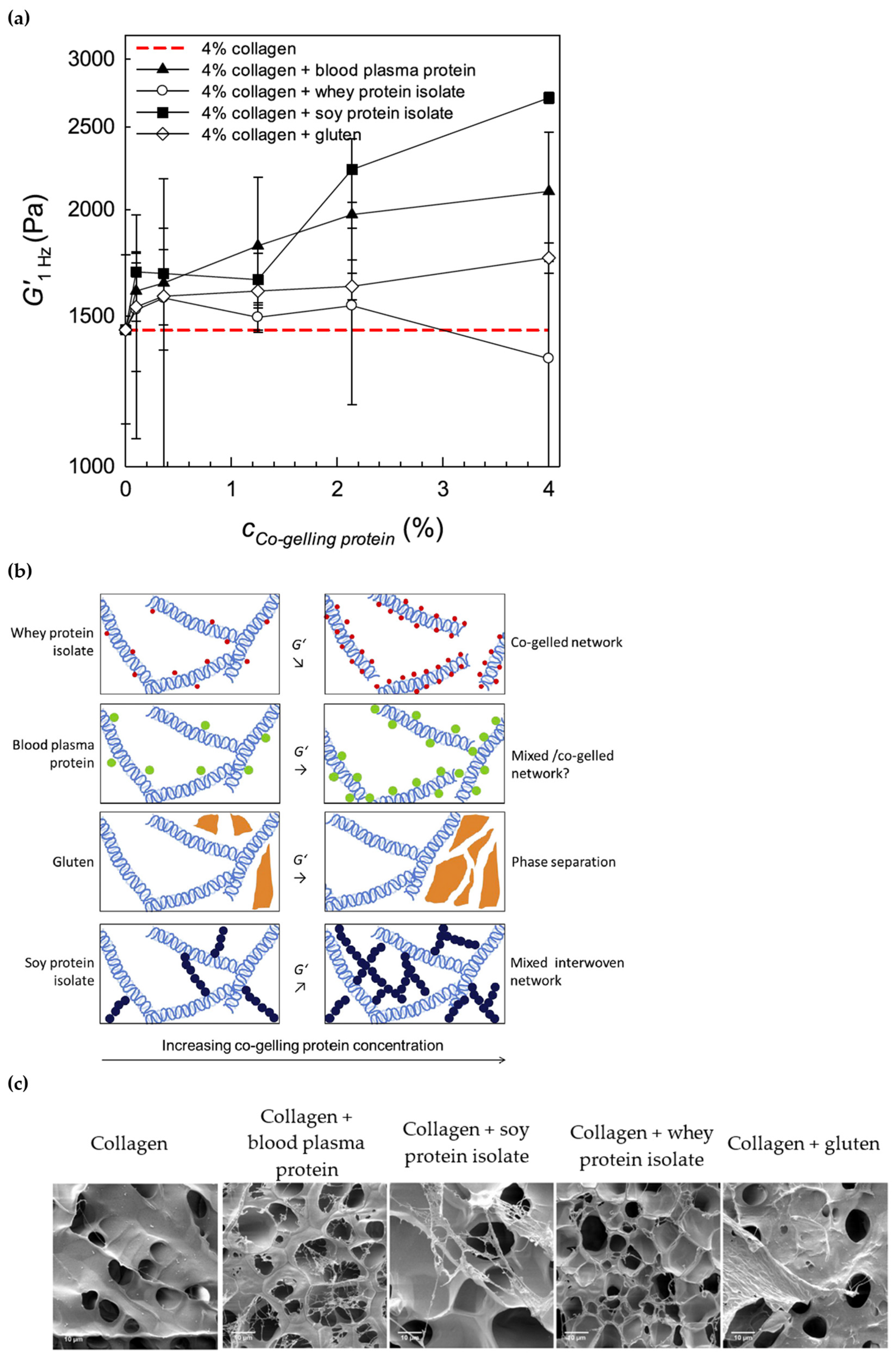 - Oechsle, A.M.; Häupler, M.; Gibis, M.; Kohlus, R.; Weiss, J. Modulation of the rheological properties and microstructure of collagen by addition of co-gelling proteins. Food Hydrocoll. 2015, 49, 118–126. [Google Scholar] [CrossRef]