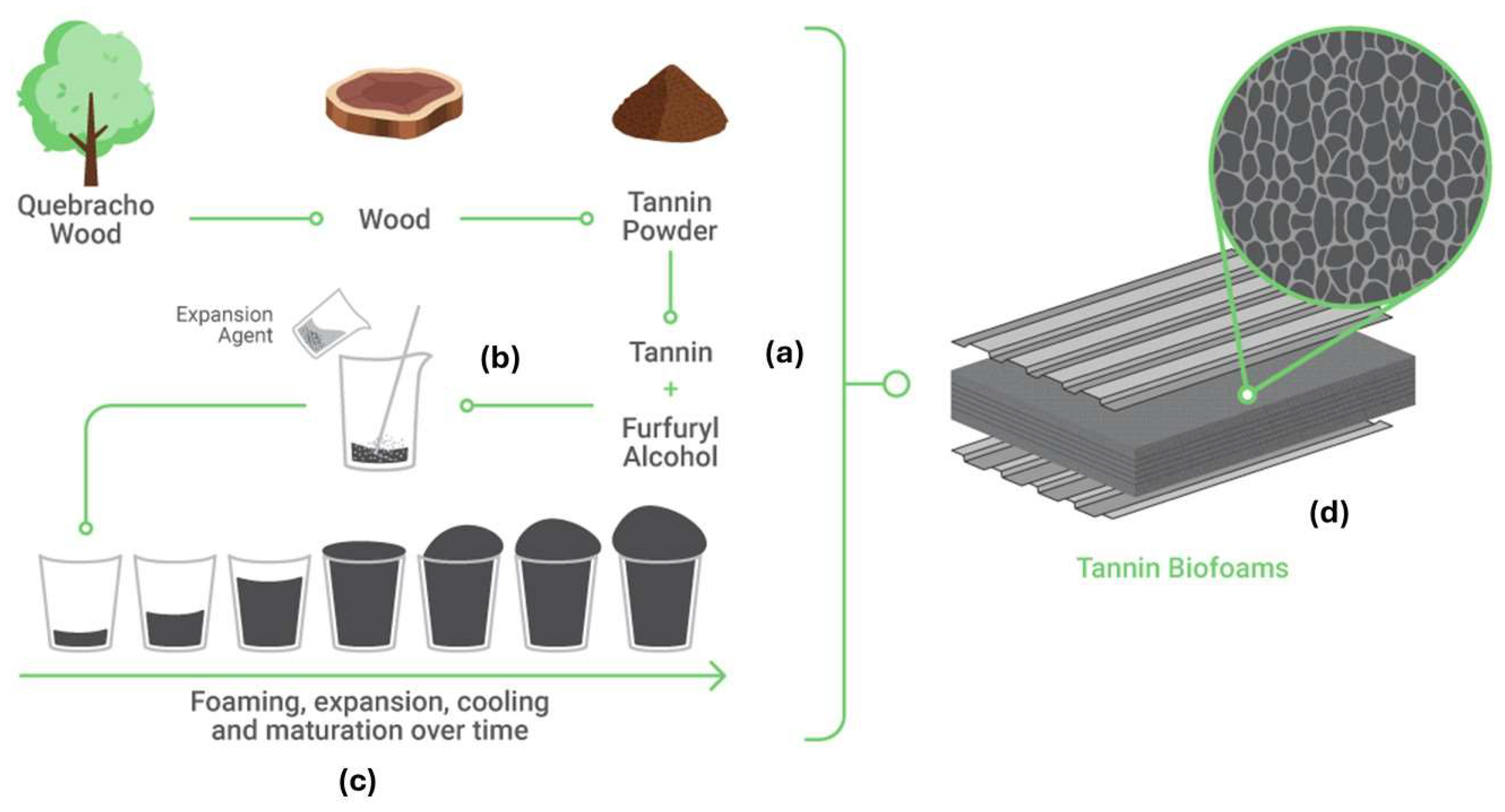 - Sepperer, T.; Barbu, M.C.; Tudor, E.M.; Fürmann, S.; Petutschnigg, A. Recyclability of tannin-furanic foams. Mater. Lett. 2023, 345, 134483. [Google Scholar] [CrossRef]