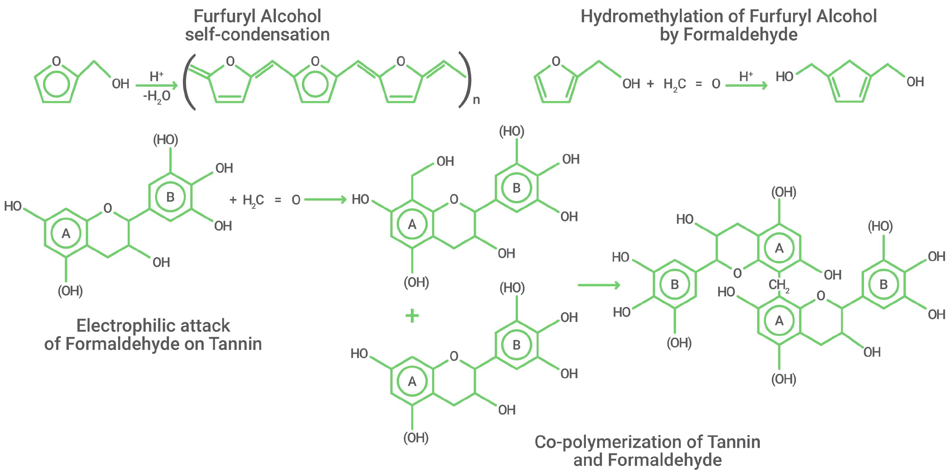 | Quebracho wood (AF-Tannin) | Formaldehyde | DE | p-toluenesulfonic acid | Tween 80, wood cellulosic fiber | Not specified | [104] |
