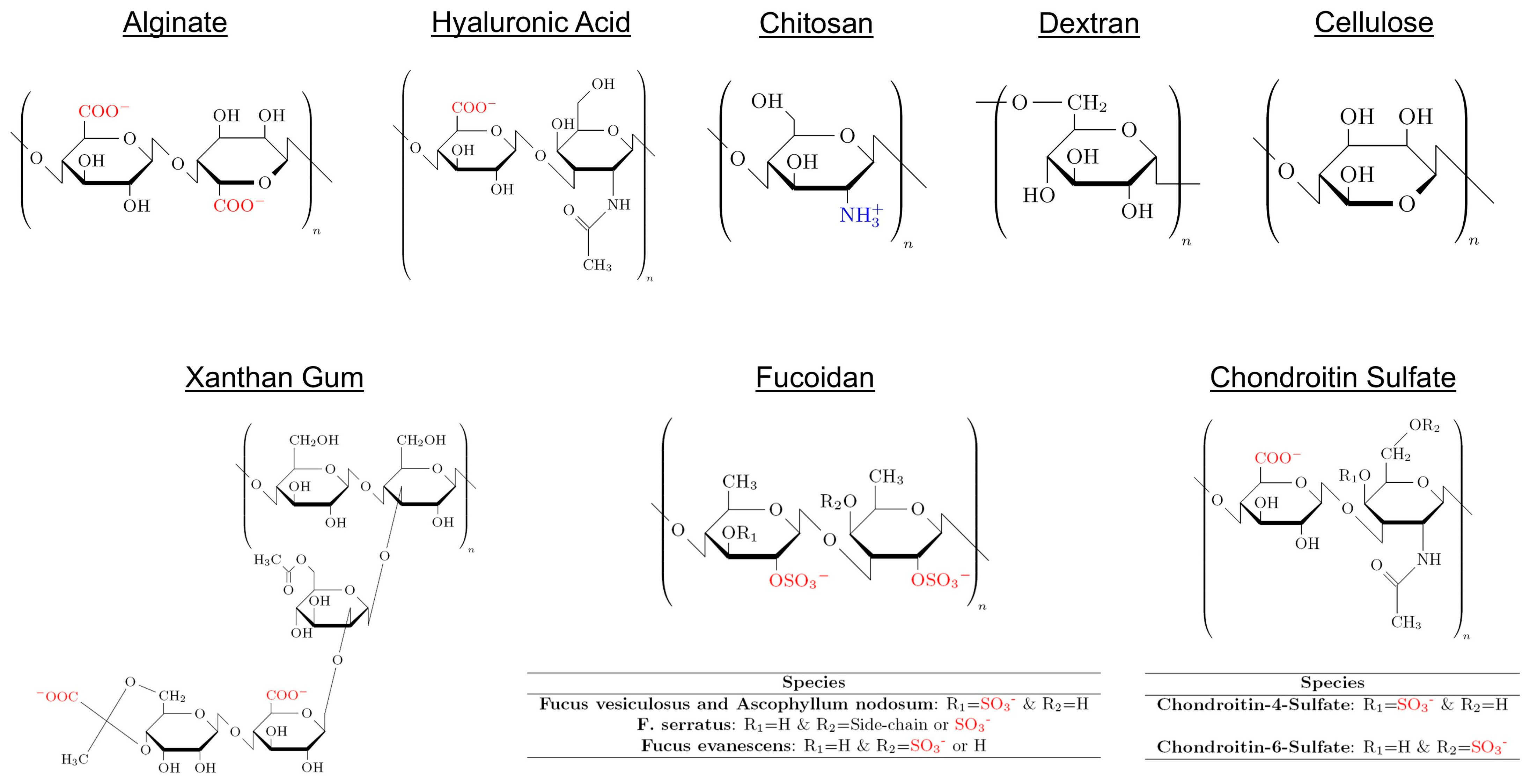 | Charge density | Ionizable groups (e.g., -COO−, -NH3+, -SO3−) | Governs electrostatic interactions, mucoadhesion, cellular uptake |