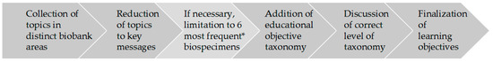 Flow chart of the process of the development of learning objectives. The * indicates the six most frequent biospecimens stored in partner biobanks of the German Biobank Alliance.