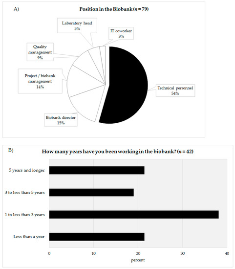 (A) Categorization of the survey participants according to their position in the biobank. (B) Work experience in years of technical personnel in biobanks.