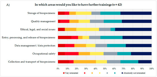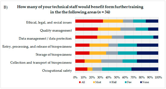 (A) Evaluation of seven presented biobank topics by the technical personnel. (B) Estimation of the coworkers of the technical personnel on how many of their technicians would need advanced training in the presented biobank topics.