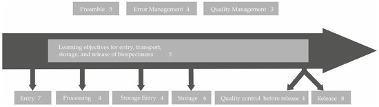 A sorting of the identified learning objectives along the typical biospecimen life cycle within a biobank. The numbers behind the topics are the numbers of learning objectives generated in this area.