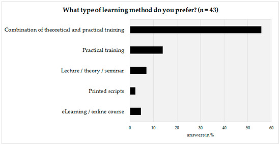 The last part of the survey was prepared to obtain information on how to design the basic framework of the advanced training program. Therefore, the technical personnel as well as their coworkers were asked to state their preferred learning method. According to survey results, a vast majority (72%, n = 31) would prefer a combination of theoretical and practical aspects, followed by a preference for practical training only (14%, n = 6) (Figure 5).
