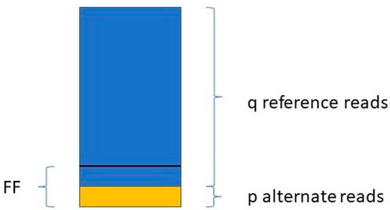 Jiang et al. [48] determine the FF in a similar way. They take only those variants into account where the mother is the homozygous reference (AA) and the fetus is heterozygous (AB). For a given variant, if the number of reads with the reference allele is q, and the number of reads with the variant allele is p (see Figure 1),