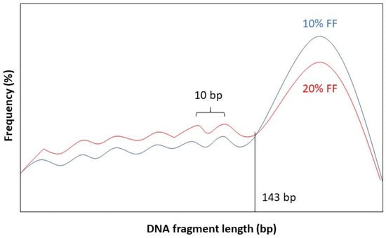 It has been observed that the fragment length boundary between short and long DNA fragments corresponds to 143 bp. This is exactly the length of a DNA molecule that wraps around a histone protein. Below 143 bp DNA fragment lengths show peaks with a periodicity of 10 bp. This 10 bp periodicity corresponds to a full 360° turn in the DNA helix, after which nuclease-sensitive sites are exposed on the DNA’s surface [58]. Furthermore, while the general shape of the distribution stays the same for different values of FF, the amplitude of the distribution curve varies. See Figure 2 for a graphical representation.