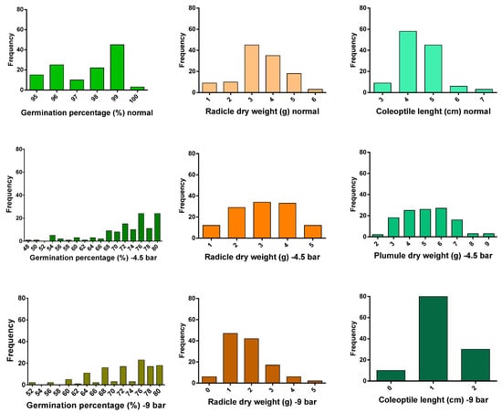 Figure 2 shows frequency distribution for the traits related to the germination stage under normal conditions and under drought stress levels of −4.5 and −9.0 bar.