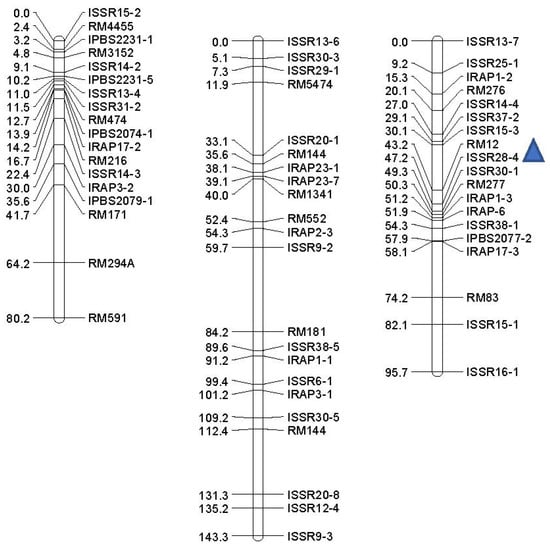 The linkage map of the 90 SSR markers and the 28 ISSR, 6 iPBS and 9 IRAP markers (265 polymorphic alleles) on 120 individuals in the F8 population divided the markers into 12 linkage groups belonging to 12 O. sativa chromosomes, with a map length of 1365.3 cm and an interval of 5.17 cm between two adjacent markers. According to Lander and Botstein [45], if the average distance between two markers is less than 20 cM, the linkage map will be used to detect QTLs. The maximum coupling length was on chromosome 11, with 143.3 centiMorgan (cM), and the minimum coupling length was 80.2 cm on Chromosome 10. Other researchers [28,46] have also drawn different genetic maps in different populations of Iranian O. sativa where the differences can be attributed to the population type, the genetic background of the populations used as well as the type and number of markers used in various studies.