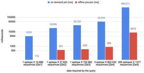 Performance measurements of the queries Qe1–5. The measurement in the column “On-demand join” are obtained by running the queries without using the pre-computed tables of mutation and epitopes. The following columns report the timings observed when executing the same queries using the pre-computed tables.