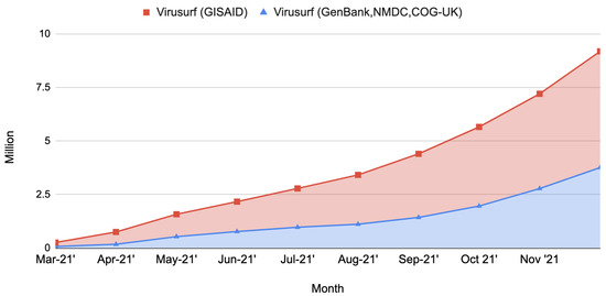 Stacked area chart showing the number of sequences imported in ViruSurf at the conclusion of each month. An increase is clearly noticeable in the performance obtained toward the end of the year 2021, corresponding to the latest improvements on both the hardware and software sides. Records about the number of sequences imported are available only from March 2021.