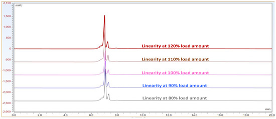 Representative CEX UPLC analysis data stacked overlay chromatogram for load linearity data from load ranging from 80 to 120%. This shows that the method is linear with good resolution in pre and post peaks from 80–120% of sample loading amount on column. X-axis represent time in mins. Additionally, Y-axis represents signal in mAU.