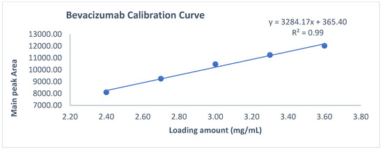 The linearity of an analytical method is its ability to obtain test results which are directly proportional to the amount/concentration of analyte in the protein sample within a specified range. Linearity of the CEX method was performed up to 3.6 mg/mL. For this study, mAb RMP Bevacizumab working standard solutions of 2.4, 2.7, 3.0, 3.3 and 3.6 mg/mL were prepared in duplicate from 25 mg/mL and injected into the Waters UPLC instrument. A calibration curve was plotted for main peak area vs. drug concentration/amount and a coefficient of determination (R2) is calculated by linear least-square regression mathematical analysis.