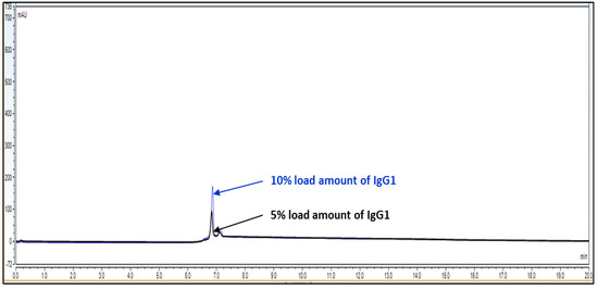Overlay representative chromatogram for IgG1 sample loading of 10% and 5%, i.e., 0.30 mg/mL and 0.15 mg/mL from 100% standard injection amount, i.e., 3.0 mg/mL for LOQ calculation.