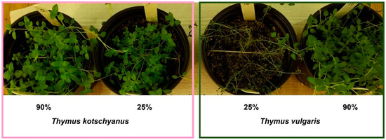 The ANOVA analysis highlighted significant differences between the two Thymus species for all of the physiological parameters analyzed (Table 3). This analysis allowed for evaluating the effects of the four irrigation regimes (degrees freedom: 3) on the two species of Thymus (degrees freedom: 1). In particular, the effects of the different irrigation regimes led to a significantly different relative water content (RWC) in both T. vulgaris and T. kotschyanus. This significant response between the two Thymus species was also observed in the total chlorophyll, carotenoids, and chlorophyll/carotenoids ratio. Figure 1 shows the different response to severe water stress for the two Thymus species. In particular, the following two extreme irrigation conditions are shown: 25% FC greater water stress and 90% FC optimal irrigation.