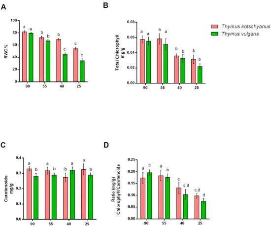 Effect of different irrigation regimes, normal irrigation (90%), mild water stress (55%), moderate water stress (40%), and severe water stress (25%) on RWC (A), total chlorophyll (B), carotenoids content (C), and chlorophyll/carotenoids ratio (D) in Thymus kotschyanus and Thymus vulgaris. Data are represented as mean ± S.E.M (bar plot). The bars with the same letter are not significantly different according to the corrected Benjamini−Hochberg t-test p ≤ 0.05.