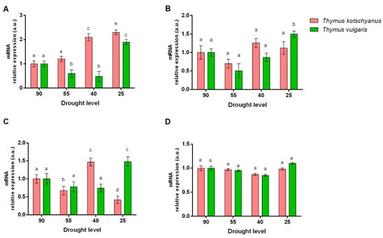 Climate change has significantly altered rainfall throughout the years by increasing drought in ecologically fragile areas of the Earth. Drought is the abiotic stress that most affects plant growth [34]. The tolerance and sensitivity of plants to drought depends on (i) intrinsic factors such as the species, cultivars, and growth stage of the plant, and (ii) extrinsic factors such as the duration and intensity of drought stress [35,36]. In this manuscript, two species of Thymus, T. vulgaris and T. kotschyanus, were subjected to different degrees of water stress, and some physiological and molecular parameters were measured. The Thymus genus includes species with different sensitivities to drought [37]. In particular, it has been previously observed that Thymus carmanicus is sensitive to drought; T. vulgaris is semi-sensitive to drought; whereas T. kotschyanus, Thymus daenensis, and T. vulgaris (cultivar Spain) are semi-tolerant to drought [19,38].
