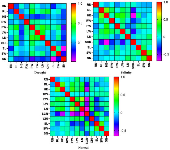 The PW had significant positive correlations with LW, LN, CHI, and SW, but it had a significant negative correlation with SN in normal conditions (Figure 1). However, PW was significantly correlated with LL in drought stress. The SCR showed significant negative correlations with RL, LL, RW, and LW. In salinity stress conditions, PW had significant positive correlations with LW, LN, and CHI but showed significant negative correlations with SCR and SL. The SCR showed significant negative correlations with RL, LL, PW, LW, and LN.