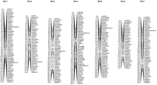 Linkage maps were prepared using 152 SSR markers, 72 ISSR alleles, 7 IRAP alleles, 29 CAAT alleles, 27 SCoT alleles, and 15 iPBS alleles (Figure 3). The mendelian ratio of 1:1 for all amplified alleles was evaluated using the chi-square test, and non-Mendelian transgressive segregate markers were not involved in map construction. The molecular markers were assigned to seven linkage groups on seven barley chromosomes. Chromosome 1 had the highest number of markers (50) and a contracting length of 131.3 cM. In addition, 39, 44, 49, 42, 33, and 45 markers were assigned to chromosomes 2, 3, 4, 5, 6, and 7, respectively. Their lengths were 190.9, 170.9, 150.1, 140.1, 121.7, and 165.3 cM, respectively (Figure 3). The arrangement of SSR markers was different from the maps in [44,45,46,49], but their chromosomal locations matched their maps.