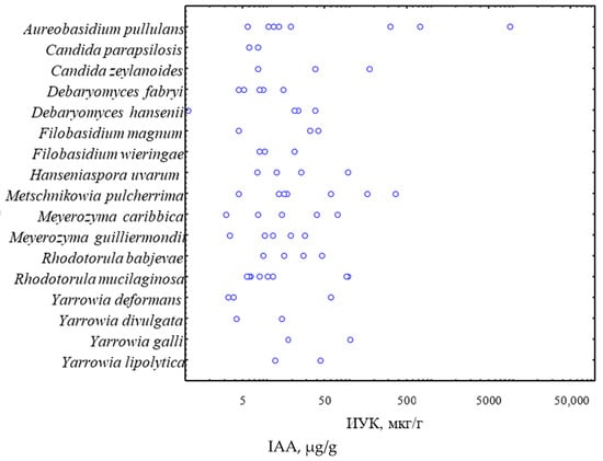Maximum IAA production (9109.2 μg/g) was found in strain A. pullulans (YE-0979) Strains of this species are regularly cited as the most active producers of IAA in various studies [12,29]. In our previous study on the phytohormonal activity of non-endophytic yeasts, we found the maximum IAA production (7990.4 µg/g) in strain Metschnikowia pulcherrima Y-5623 [27]. In this study, the endophytic strains of this ascomycetous yeast species also showed high IAA activity.