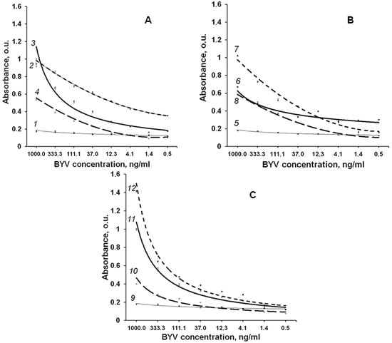 Sensitivity of the obtained antisera. (A) antiserum to ep1; (B) antiserum to ep2; (C) antiserum obtained to mix of the epitopes ep1 and ep2. Curves’ numbers show antiserum-antigen pairs analysed: 1, 5, 9—pre-immune sera and native BYV; 2—antiserum to ep1 and ep1; 3—antiserum to ep1 and native BYV; 4—antiserum to ep1 and healthy plant control; 6—antiserum to ep2 and native BYV; 7 antiserum to ep2 and ep2; 8—antiserum to ep2 and healthy plant control; 10—antiserum obtained to the mix of epitopes ep1, ep2 and healthy plant control; 11—antiserum obtained to the mix of epitopes ep1, ep2 and native BYV; 12—antiserum obtained to the mix of epitopes ep1, ep2 and mix of these epitopes.