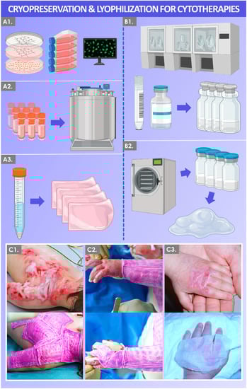 Schematic and illustrative workflow of cryopreservation (A1–A3) and lyophilization (B1,B2) processes used in the manufacture of topical cytotherapies or derivatives for cutaneous wound management (C1–C3) under the Swiss progenitor cell transplantation program. (A1) Following in vitro primary progenitor cell type (e.g., FE002-SK2 cells, FE002-Ten cells, FE002-Cart cells) establishment, extensive characterization, and validation work is performed to qualify the standardized biological materials in view of cytotherapeutic use. (A2) Multi-tiered in vitro cell banking is used for the manufacture and the long-term storage of the primary progenitor cellular materials. (A3) Following medical prescription, viable progenitor cells are initiated from cryostorage and are used to prepare standardized transplant products for cutaneous wound management (e.g., progenitor biological bandages). (B1) To resolve several logistical and stability issues, cellular materials and cell-free derivatives are used to formulate appropriate liquid preparations containing cryoprotectants and/or lyoprotectants. (B2) The cellular extracts and/or derivatives are then stabilized by two-step lyophilization processing, which enables long-term storage and reconstitution in a wide variety of appropriate pharmaceutical preparations for clinical delivery (e.g., hyaluronan-based hydrogels, oil-in-water creams or ointments). (C1–C3) Documented illustrative examples of pediatric burn patient wounds treated with cultured and cryopreserved cells formulated into progenitor biological bandages (PBB) in the Lausanne burn center (Lausanne, Switzerland). Previous studies have shown that PBB cytotherapeutic treatment of the burn wounds enables enhanced quality of cutaneous repair, with restored structure and function and diminished rates of complication as compared to the use of standard wound dressings. Modified and adapted with permission [11,12,15].