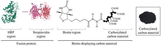 Coal has long been an important energy resource to support industry. As coal can be used not only as a fuel but also as a low-cost source of carbon powder at a few USD·kg−1, to date it has been greatly in-demand. Moreover, adding the values of carbon powder provides a new method of using carbon materials for society. Therefore, with the granulation technology of carbon powder, a new ‘carbon material’ was prepared in this research. The carbon material can be easily collected with sedimentation either by its own weight or low-speed centrifugation. The property of the sediments conceptually suits enzyme reuse so that the availability of the carbon materials is remarkably improved, selectively displaying enzymes on the carbon materials. To develop a technique for displaying the targeted enzyme on carbon materials and to demonstrate the reuse of the displaying enzyme, in this study the construction of the technology needed to set up the scaffold for enzyme display on the surface of the carbon materials was tried based on chemical and biological techniques (Figure 1). Firstly, carboxylation on the surface of carbon materials was attempted. The carboxylated carbon materials were fabricated with carbon powder treated by hypochlorite to carboxylate its surface. Secondly, the biotin display connecting to the carboxy group on carbon materials was purposed. In biotechnology, hydrazide groups are aldehyde-reactive chemical groups used as biomolecular probes that crosslink and label carbonyls such as proteins and sugars [11]. Additionally, the interaction of biotin with avidin has been extensively used for the detection and purification of specific proteins [12,13]. The avidin–biotin interaction has been used for highly sensitive evaluation since this interaction is highly stable (dissociation constant KD = 10−15 M), and as the interacting part is small in size and hardly interferes with the functionality of the labeled molecule [14]. The hydrazide group of biotin hydrazide was reacted with the carboxy group on the surface of the carbon materials as a cross-linking target, and biotin display on the carbon materials was tried. Finally, the specific display of avidin-fused enzymes targeting biotin on the carbon materials was achieved. To evaluate the construction of the enzyme-displaying system on the carbon materials, streptavidin-fused horseradish peroxidase (HRP), universally used as the labelling enzyme on SDS-PAGE [15], was used because of its stability and high reaction activity.
