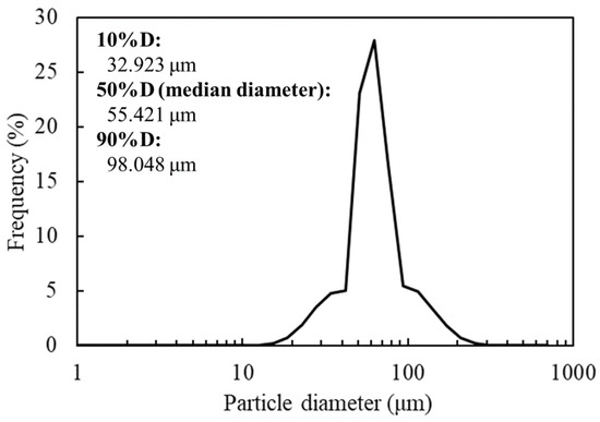 The SEM image revealed the spherical structure of the carbon materials visually (Figure 2). According to the analysis of 1000 particles of carbon materials in SEM images, the particles showed 1.1 ± 0.1 of the aspect ratio so that the carbon materials were slightly elongated spherical structures. In addition, non-uniformity in the sizes of the structures was also revealed. The particle sizes of the carbon materials were investigated with a laser diffraction particle size analyzer to reveal the particle size (Figure 3). Analysis of the cumulative distribution of the particle size frequency showed that the particle sizes at 10%, 50% (a median diameter), and 90% of the cumulative distribution were 32.923 µm, 55.421 µm, and 98.048 µm, respectively. While 80% of the appearance frequency of the particles of the carbon materials was in the range of 32.923–98.048 µm, the lower limit of 0.03 to 20 µm and the upper limit of 170 to 700 µm were included in less than 1% at each fraction. Additionally, the properties of the carbon materials were evaluated in terms of material engineering and chemistry (Table 1). In terms of the material engineering properties of the carbon materials, the specific surface area, pore volume, and averaged pore diameter of the carbon materials and MOGUL were 130 m2·g−1 and 128 m2·g−1, 0.55 cm3·g−1 and 0.69 cm3·g−1, and 17.2 nm and 22.1 nm, respectively. On the other hand, in terms of chemistry, the whole amount of acidic functional group per gram of carbon material and MOGUL were 0.29 mEq·g−1 and 0.51 mEq·g−1, respectively. To survey the presence and sizes of the pores of the carbon materials, the data of the adsorption amount were plotted related to the relative pressure as the analysis of the adsorption–desorption isotherm (Figure 4). Although the plot patterns in the adsorption and desorption isotherms did not exhibit significant differences, the plot patterns showed a hysteresis loop with the closing point. An analysis of the logarithmic differential pore volume distribution was conducted to reveal the distribution of pore sizes in the carbon materials (Figure 5). The frequent pore size was 44.23 nm, and the log differential pore volume was 0.9806 cm3·g−1. However, regarding the frequent pore size, the ratio of the log differential pore volume at the frequent pore size was only 10.8% of the whole log differential pore volume. Additionally, the average and standard deviation of the log differential pore volume of all the carbon materials were 0.232 cm3·g−1 and 0.282 cm3·g−1, respectively. On the other hand, in 10–90% of the cumulative distribution of the log differential pore volume, the average and standard deviation were 0.558 cm3·g−1 and 0.273 cm3·g−1, respectively.