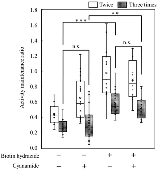 The activity maintenance ratio was calculated based on data of an absorbance of 650 nm with the carbon materials after preparation under different conditions of biotin hydrazide and cyanamide to display HRP. The values were averaged from 12−17-time experiments. In Figure 7, the significance levels are indicated by asterisks (**: p < 0.01 and ***: p < 0.001) and n.s. (not significant).