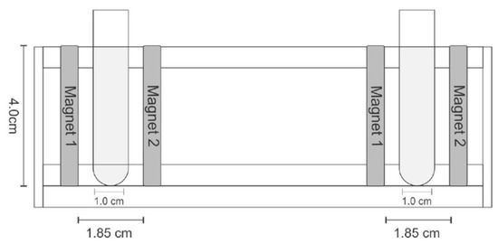 The Michaelis constant (Km) and maximum reaction rate (Vmax) were calculated using the Lineweaver–Burk plot of FFase activity versus sucrose concentrations (25 ≤ S0 ≤ 700 mg mL−1). The influence of static magnetic flux (SMF) on kinetic parameters was investigated using two neodymium magnets (4.0 cm × 0.2 cm × 0.5 cm) generating a magnetic field with 1450 G (0.145 T) magnetic flux density. Magnets were maintained at standardized distances using the apparatus described in Figure 1 during the FFase activity determination.