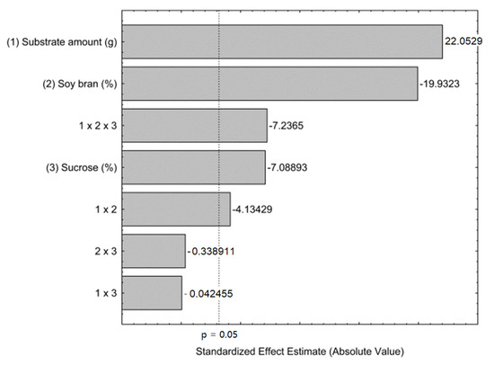 The statistical analysis was performed and was expressed in Pareto chart (Figure 2) and it was observed that all independent variables present a significant effect on FFase production. The substrate amount presents a positive effect on FFase production, on the other side, the proportion of soy bran and sucrose concentration presents a negative effect. The substrate amount can be related to the aeration of the fermentative system, and higher substrate amounts are related to lower O2 available for aerobic processes. Despite the proved positive impact of the addition of soy bran to SSF cultivation medium, it was observed that this variable presented a negative effect, indicating that lower percentages of this component enable improvement in enzyme production. As is known, sucrose is considered the best carbon source to produce enzymes with transfructosylating activity [20]. However, it was observed that lower levels of this variable can obtain higher levels of FFase production. The tertiary interaction of all variables evaluated present an antagonistic, statistically significant interaction.
