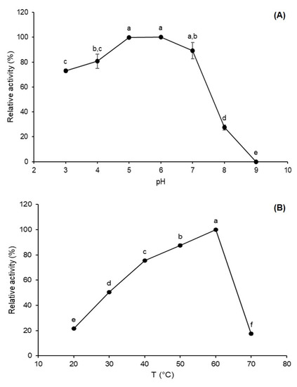 Effect of pH (A) and temperature (B) on FFase from A. tamarii Kita UCP 1279 obtained by solid-state fermentation using a mixture of wheat and soy bran as substrate. Different letters (a–f) indicate significant differences (p < 0.05).