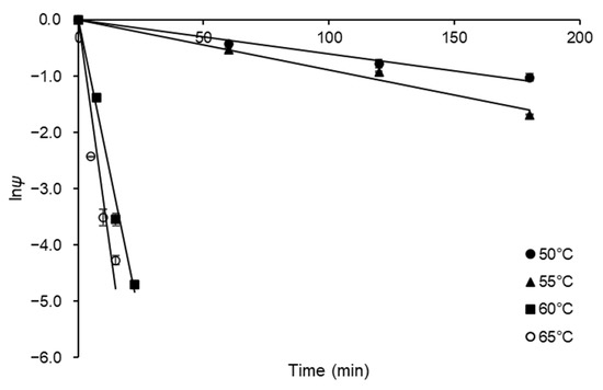 The FFase thermal denaturation was evaluated at 50–65 °C by residual activity experiments during a maximum time interval of 180 min. Taking account of the denaturation process can be represented as a temperature-dependent first-order reaction and represented in logarithm form by Equation (1); the deactivation rate constant (kd) can be estimated by plotting the experimental data of lnψ versus time. ψ is the residual activity coefficient, calculated by the ratio of the residual enzyme activity (A) to that at the beginning of thermal treatment (A0).