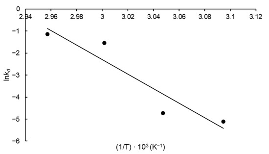 The thermodynamic parameters corresponding to FFase thermal deactivation were also calculated. This included the activation energy of enzyme thermal denaturation (E*d) estimated according to the slope of the Arrhenius-type plot (Figure 5) obtained by plotting lnkd versus the reciprocal absolute temperature (1/T) and a particular elevated value for this parameter was obtained (274.29 kJ mol−1). The parameters ΔH*d, ΔS*d and ΔG*d were calculated for each temperature evaluated and were given in Table 2.