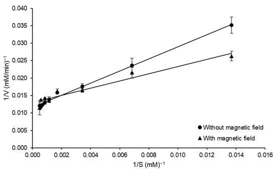 The kinetic parameters related to the catalyzed reaction (Km and Vmax) were investigated in the presence and absence of a magnetic field. To best of our knowledge, this is the first report of this approach on the kinetic study of FOS-forming enzymes and can contribute to the understanding of the impact of a magnetic field on the structural and catalytic properties of the enzyme. The results of both experimental conditions were adjusted with suitable correlation (0.941 ≤ R2 ≤ 0.994) to the Lineweaver Burk plots, as observed in Figure 6. The Km values were 149.70 and 81.73 mM without and with magnetic field, respectively, and a decrease in Vmax with the exposition of magnetic field (86.20 to 76.92 mM min−1) was also observed.
