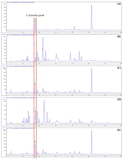 The quantification of L-tyrosine in samples was carried out using the reverse-phase high-performance liquid chromatography (RP-HPLC) method described by Raisa et al. [] with minor modifications. The analysis was performed using an HPLC system (1200 series, Agilent Technologies, Inc., Santa Clara, CA, USA) equipped with an ultraviolet (UV) detector. The Intersil® ODS-3 column (4.6 × 150 mm, 5 µm) (GL Sciences, Shinjuku-ku, Japan) was used to separate the L-tyrosine. The mobile phase consisted of two solutions: Solution A, which contained 1.4 mM of sodium acetate (RCI Labscan, Bangkok, Thailand), 0.1% trimethylamine, and 6% acetonitrile (RCI Labscan, Bangkok, Thailand) with a pH of 6.1, and Solution B, which was 60% acetonitrile. Both solutions were filtered through a 0.45 µm nylon membrane filter (Filtrex Technologies, Bengaluru, India). The column was eluted using Solution B for 70 min with a linear gradient ranging from 0–100% as described by Park and Oh []. The peaks were detected at 254 nm and the standard L-tyrosine was added to the samples (standard addition method) to confirm the peak corresponded to L-tyrosine. The column was regenerated and equilibrated with eluent A for 10 min. A new and freshly reconstituted sample was injected, either by manual injector or autosampler/injector, and analyzed every 70 min.