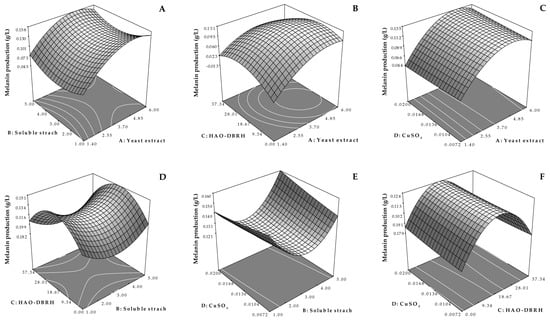Three-dimensional response surface graphs showing the effect of yeast extract and HAO-DBRH on melanin production: (A) yeast extract vs. soluble starch; (B) yeast extract vs. HAO-DBRH; (C) yeast extract vs. CuSO4; (D) soluble starch vs. HAO-DBRH; (E) soluble starch vs. CuSO4; and (F) HAO−DBRH vs. CuSO4.