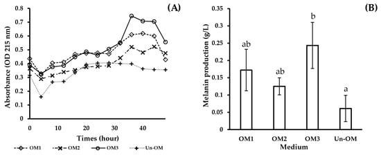 Production of melanin by S. antiibioticus NRRL B-1701 in a culture medium: (A) Optical density at 215 nm; (B) melanin production (g/L) at 36 h. Different lowercase letters indicate significant differences among the four culture mediums in melanin production (p < 0.05)