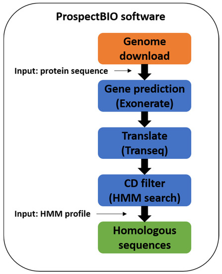 The ProspectBIO software (IP registry BR512018000940-9) provides searches in genomes for genes coding proteins with sequence similarity to an enzyme/protein of interest. It modularly manages the genome downloads, the similarity-based gene prediction and translation, and the protein sequence filtering by conserved domain (Figure 1). Initially, a group of genomes of interest is selected based on species or genus name or even taxonomic terms like “fungi”, “bacteria”, etc. They are downloaded from the NCBI GenBank and RefSeq databases without gene predictions. Subsequently, the input sequence is used as a reference by the EXONERATE program [37] to identify genes that encode homologous proteins in each downloaded genome followed by the creation of the coding (CDS) and protein FASTA sequences. To check the integrity of the predicted proteins and avoid the selection of low-quality or fragments, ProspectBIO optionally performs a search for a preset conserved domain (CD) using the HMMsearch program [27]. The user must have the CD HMM file in a Pfam-like format to allow the filtering of the predicted proteins having at least one copy of that CD. The user can identify the CD in the reference protein using InterPro (https://www.ebi.ac.uk/interpro/search/sequence/, accessed on 5 August 2019) and its Pfam HMM file must be manually downloaded at the “curation” tab of the CD entry (ex: https://www.ebi.ac.uk/interpro/entry/pfam/PF00001/curation/, accessed on 5 August 2019). Thus, the ProspectBIO final result is stored in a single FASTA file where each sequence is named with a code plus the EXONERATE score, the HMMsearch score, and the identity and similarity percentages compared to the reference sequence.