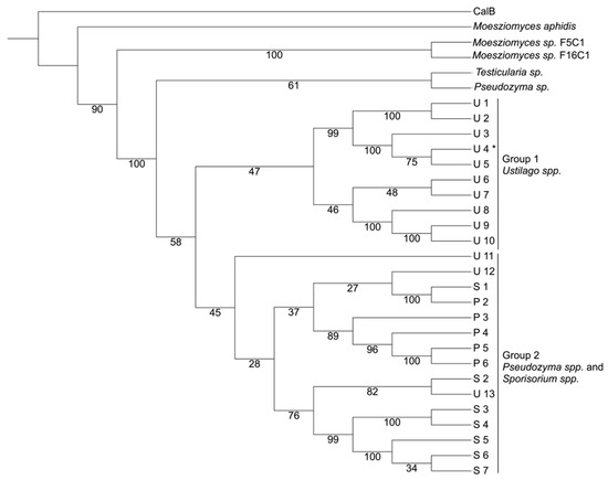 Phylogenetic tree of the prospected sequences with greater than 70% identity with CaLB (P41365). The groups were created selecting the branches where there were few species with high frequencies. Group 1—Ustilago spp.; and Group 2—Pseudozyma spp. and Sporosorium spp. The outgroup sequence was CaLB. The Ustilago hordei (CCF54401) is U4 and the Sporisorium scitamineum SSC39 (CP010917) is S6. The numbers represent the bootstrap values. * Lipase studied in this manuscript.