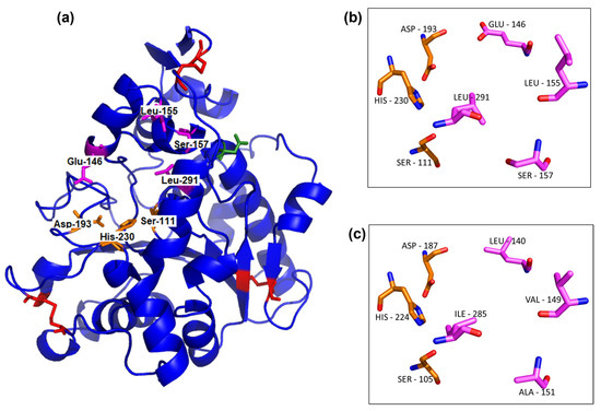 The UhL model was calculated by the SWISS-MODEL using CaLB (PDB number: 1TCA) as the template (Qmean = 0.16; GMQE = 0.92). Sticks in red are the disulfide bonds, in orange the catalytic triad (Ser111, Asp193, His230), in green the glycosylation site, and in pink the four amino acid differences between UhL and CaLB (a). The catalytic triad and four different amino acids in the active pocket are shown in detail for UhL model (b) and CaLB structure (c). The oxygen and nitrogen atoms are shown in red and blue, respectively, in panels (b,c).