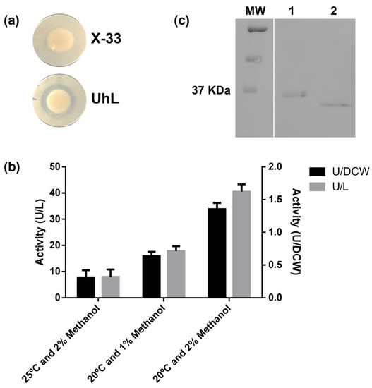 Tributyrin is a triglyceride widely used to detect lipase activity [39,40]. The reference strain X-33 and transformants harboring the UhL-encoding gene were grown in the presence of tributyrin substrate (Figure 4a) and the hydrolysis halos were shown for the positive recombinants. Activity was detected in the supernatant of the cultures after 144 h of fermentation (Figure 4b). Different induction conditions were tested, including the incubation temperature (20 and 25 °C) and inductor concentration (1 and 2% methanol).