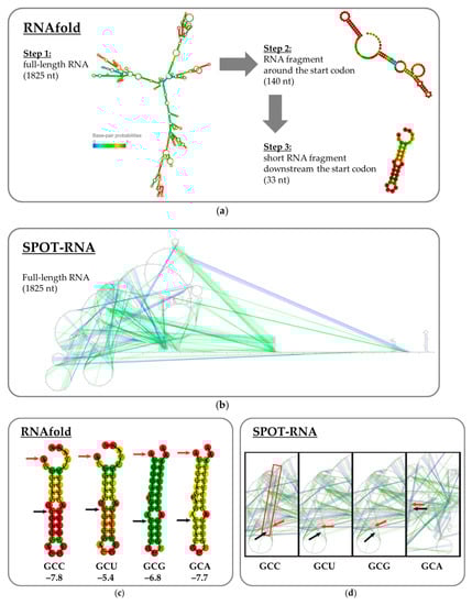 - Lorenz, R.; Bernhart, S.H.; Höner Zu Siederdissen, C.; Tafer, H.; Flamm, C.; Stadler, P.F.; Hofacker, I.L. ViennaRNA Package 2.0. Algorithms Mol. Biol. 2011, 6, 26. [Google Scholar] [CrossRef]