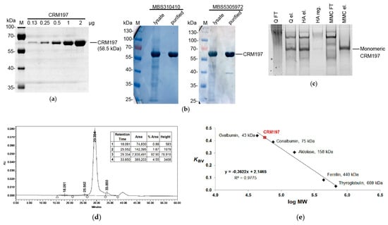 - Mishra, R.P.N.; Yadav, R.S.P.; Jones, C.; Nocadello, S.; Minasov, G.; Shuvalova, L.A.; Anderson, W.F.; Goel, A. Structural and immunological characterization of E. coli derived recombinant CRM197 protein used as carrier in conjugate vaccines. Biosci. Rep. 2018, 38, BSR20180238. [Google Scholar] [CrossRef]