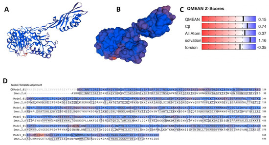 Modeled MRSA−MecA protein structure. (A) The carton structure of the modeled MRSA−MecA protein. (B) The surface structure of the modeled MRSA−MecA protein. (C) QMEAN of the modeled MRSA−MecA protein. (D) Model−template alignment of the MecA to the structure of nitrocefin acyl−Penicillin binding protein 2a (1MWS) from the methicillin-resistant Staphylococcus aureus strain.