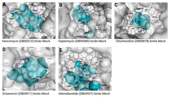 Predicted binding of MecA protein to (A) vancomycin, (B) daptomycin, (C) chlorhexidine, (D) oritavancin, and (E) afamelanotide. The binding site of the MecA protein is shown in a gray color, whereas the ligands are presented in a blue color. The DrugBank accession numbers are shown in brackets, whereas the different binding residues of the MecA are written in black.