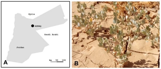 Saltbush native to Azraq. (A) A map of Jordan showing the Azraq region. (B) Saltbush growing in nature (Azraq) under dry and saline conditions; picture taken in mid-June 2022.