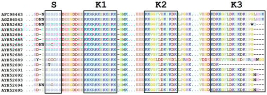The highly conserved K1-segment (KKKRKKEKKEKK) was evident for different Atriplex species and accessions (Figure 3). Three amino acid substitutions were found in A. canescens (AFC98463); K3R was due to a codon change from AAG > AGG; K5R and K8R, the last two substitutions, resulted from a codon change from AAG to AGG.