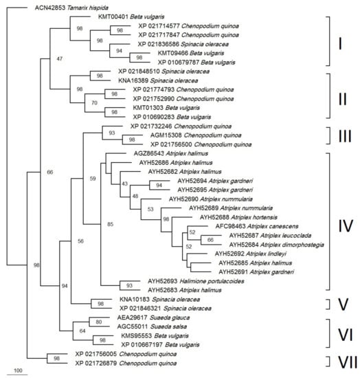 On the contrary, in a previous study, A. halimus was clustered away from A. dimorphostegia based on the atpB-rbcL spacer sequence, while A. nummularia and A. hortensis were clustered together and away from A. halimus and A. leucoclada based on ITS sequences []. This could mean that the DHN protein sequence is more conserved among Atriplex spp than DNA-based sequences (e.g., the atpB-rbcL spacer and ITS sequences). Atriplex and Chenapodium were clustered together but away from Beta vulgaris (Subfamily Betoidieae) based on trnL-F and rpl16 sequences [], the ITS sequence [], and the matK/trnK sequence []. Likewise, our data showed two groups of Chenapodium DHNs, one that was clustered with Atriplex in a superclade resolved with an 80% bootstrap value and another group clustered into two major clades with Beta and Spinacia.